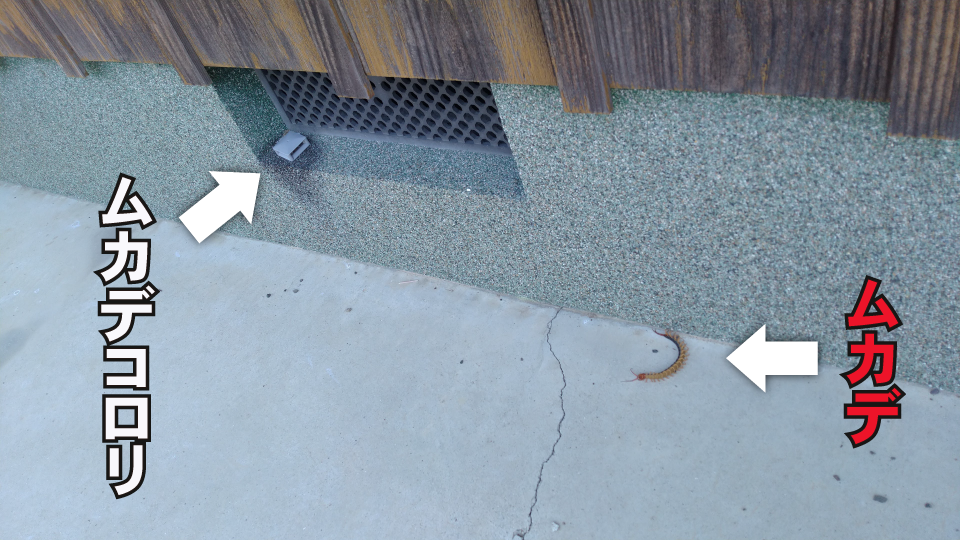 - 私は今回、床下通気口のそばにムカデコロリを設置しました。床下通気口は、外から空気を取り込むために開けられた穴です。この穴からムカデが入ってくることがあります。床下通気口のそばにムカデコロリを置くことで、家の中に入らせないようにしました。